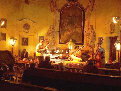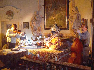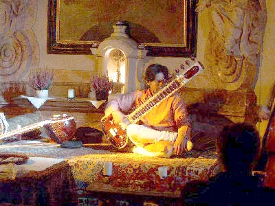 Wirklich selten gibt es diese Möglichkeit: Bei Kerzenschein in der Schloßkapelle aus dem 12. Jahrhundert konnte das Publikum die Ragas der Großmeister auf zwei Sitars mit Tablabegleitung zu genießen. Begleitet wurden Sie von unserem Lieblingsbasist Reinhard Ziegerhofer, der als interessante Erweiterung gewonnen werden konnte... da wir die Ruhe währenddessen nicht stören wollten. |