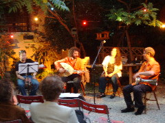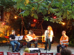 Ein herrlicher, lauer Abend im Juni. Eine wunderbare Stimmung. Dazu das Ruth Yaakov Ensemble, nur mit einem Verstärker für die Stimme. Kein Bühnenpodest, ganz einfach und erdig, präsentierten sie sich mit einer virtuosen und berührenden Darbietung der Musik sephardischer Juden. Ruth Yaakovs (Israel) ausdrucksvoller a Capella-Gesang, ergänzt durch die improvisierten Taqsime, Interludien und Tänze auf dem Ud , Percussion und Klarinette , wurde einfühlsam von Juan Carlos Sungurlian (Uruguay), Levent Tarhan (Türkei), und Hidan Mamudov (Mazedonien) untermalt. Manch´ ein Lied war auch rein instrumental, und erfreute die leise horchenden Gäste. Da wir die Stimmung nicht durch laufendes "Blitzen" stören wollten, gibt es leider nur wenige Bilder von diesem einmaligen Abend... |